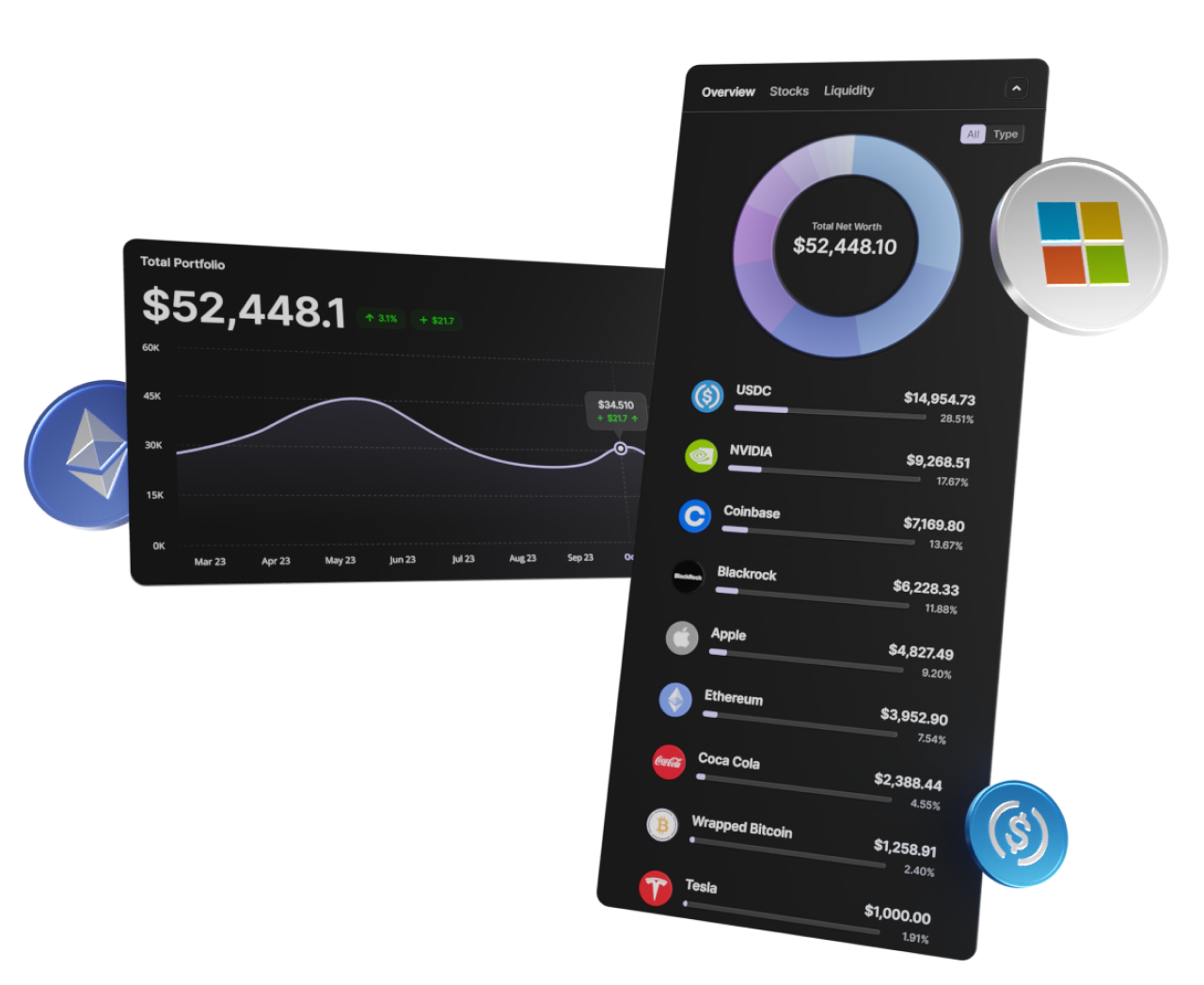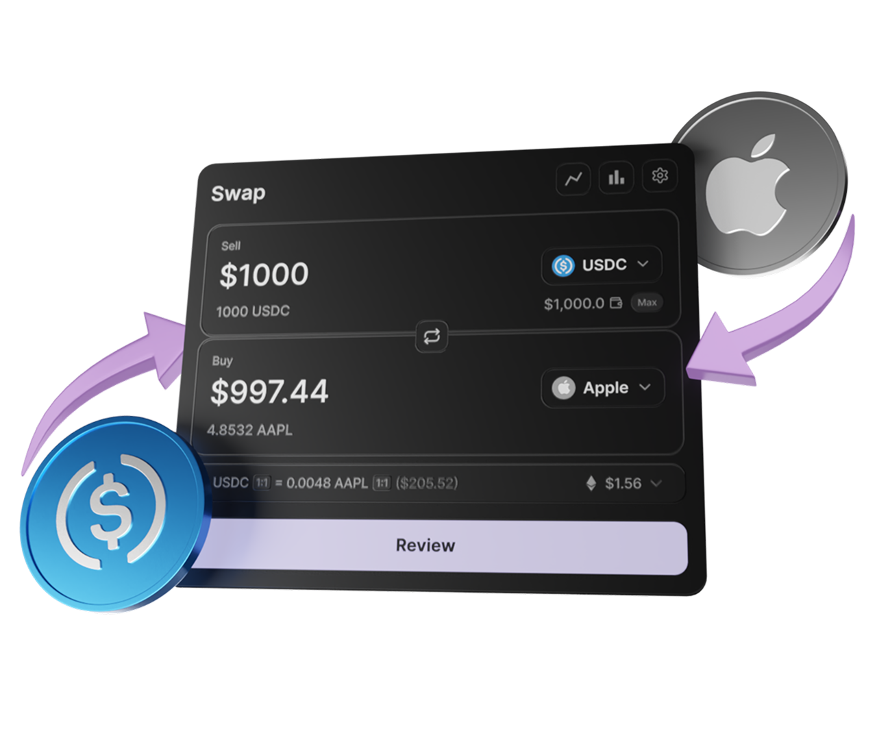 Seamlessly swap between crypto and stocks in just a few clicks.